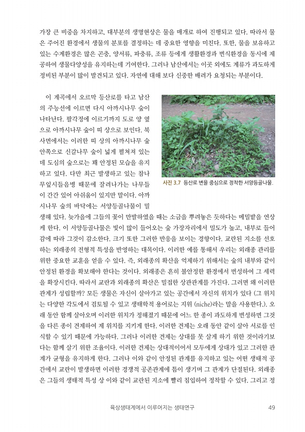 육상생태계에서 이루어지는 생태연구 49 가장 큰 비중을 차지하고, 대부분의 생명현상은 물을 매개로 하여 진행되고 있다. 따라서 물 은 주어진 환경에서 생물의 분포를 결정하는 데 중요한 영향을 미친다. 또한, 물을 보유하고 있는 수계환경은 많은 곤충, 양서류, 파충류, 조류 등에게 생활환경과 번식환경을 동시에 제 공하여 생물다양성을 유지하는데 기여한다. 그러나 남산에서는 이곳 외에도 계류가 과도하게 정비된 부분이 많이 발견되고 있다. 자연에 대해 보다 신중한 배려가 요청되는 부분이다. 이 계곡에서 오르막 등산로를 타고 남산 의 주능선에 이르면 다시 아까시나무 숲이 나타난다. 팔각정에 이르기까지 도로 양 옆 으로 아까시나무 숲이 띠 상으로 보인다. 북 사면에서는 이러한 띠 상의 아까시나무 숲 안쪽으로 신갈나무 ...