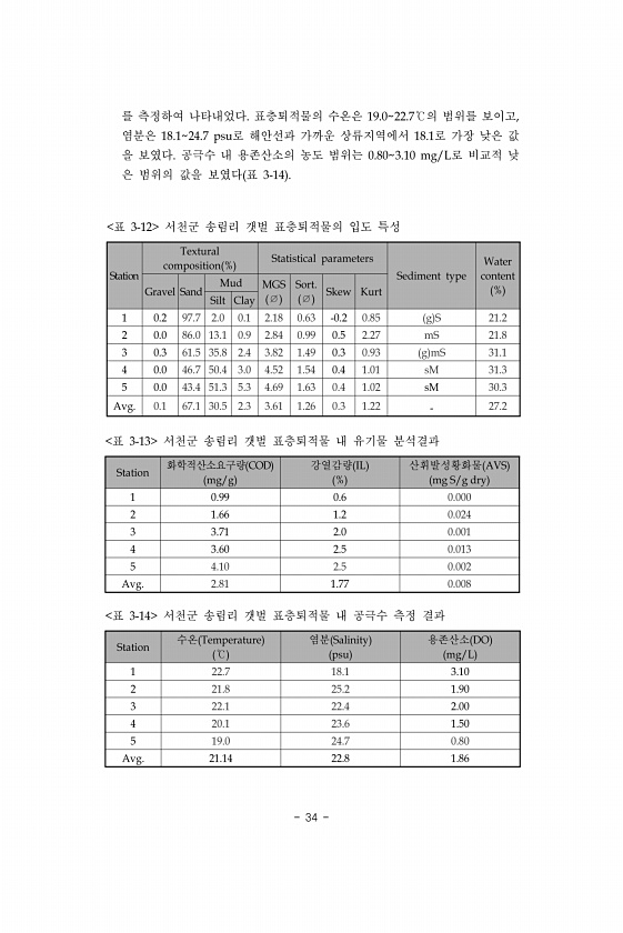 34 를 측정하여 나타내었다. 표층퇴적물의 수온은 19.022.7℃의 범위를 보이고, 염분은 18.124.7 psu로 해안선과 가까운 상류지역에서 18.1로 가장 낮은 값 을 보였다. 공극수 내 용존산소의 농도 범위는 0.803.10 mg/L로 비교적 낮 은 범위의 값을 보였다 표 3-14 Station Textural composition % Statistical parameters Sediment type Water content Gravel Sand Mud MGS % ? Sort. Silt Clay ? Skew Kurt 1 0.2 97.7 2.0 0.1 2.18 0.63 -0.2 0.85 g S 21.2 2 0.0 86.0 13.1 0.9 2.84 0.99 0.5 2.27 mS 21.8 3 0.3 61...