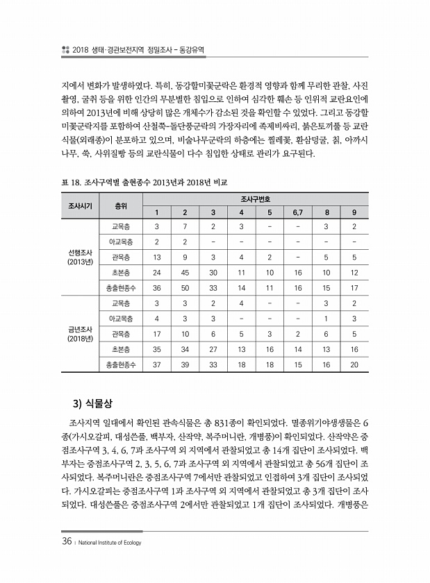 2018 생태·경관보전지역 정밀조사 동강유역 36 ? National Institute of Ecology 지에서 변화가 발생하였다. 특히, 동강할미꽃군락은 환경적 영향과 함께 무리한 관찰, 사진 촬영, 굴취 등을 위한 인간의 무분별한 침입으로 인하여 심각한 훼손 등 인위적 교란요인에 의하여 2013년에 비해 상당히 많은 개체수가 감소된 것을 확인할 수 있었다. 그리고 동강할 미꽃군락지를 포함하여 산철쭉-돌단풍군락의 가장자리에 족제비싸리, 붉은토끼풀 등 교란 식물 외래종 이 분포하고 있으며, 비술나무군락의 하층에는 찔레꽃, 환삼덩굴, 칡, 아까시 나무, 쑥, 사위질빵 등의 교란식물이 다수 침입한 상태로 관리가 요구된다. 조사시기 층위 조사구번호 1 2 3 4 5 6,7 8 9 선행조사 2013년 교목층 3 ...