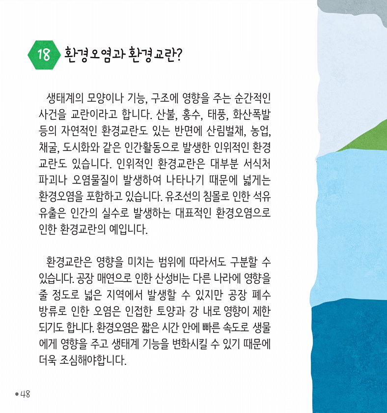 ●48 18 생태계의 모양이나 기능, 구조에 영향을 주는 순간적인 사건을 교란이라고 합니다. 산불, 홍수, 태풍, 화산폭발 등의 자연적인 환경교란도 있는 반면에 산림벌채, 농업, 채굴, 도시화와 같은 인간활동으로 발생한 인위적인 환경 교란도 있습니다. 인위적인 환경교란은 대부분 서식처 파괴나 오염물질이 발생하여 나타나기 때문에 넓게는 환경오염을 포함하고 있습니다. 유조선의 침몰로 인한 석유 유출은 인간의 실수로 발생하는 대표적인 환경오염으로 인한 환경교란의 예입니다. 환경교란은 영향을 미치는 범위에 따라서도 구분할 수 있습니다. 공장 매연으로 인한 산성비는 다른 나라에 영향을 줄 정도로 넓은 지역에서 발생할 수 있지만 공장 폐수 방류로 인한 오염은 인접한 토양과 강 내로 영향이 제한 되기도 합니다. 환경오염...
