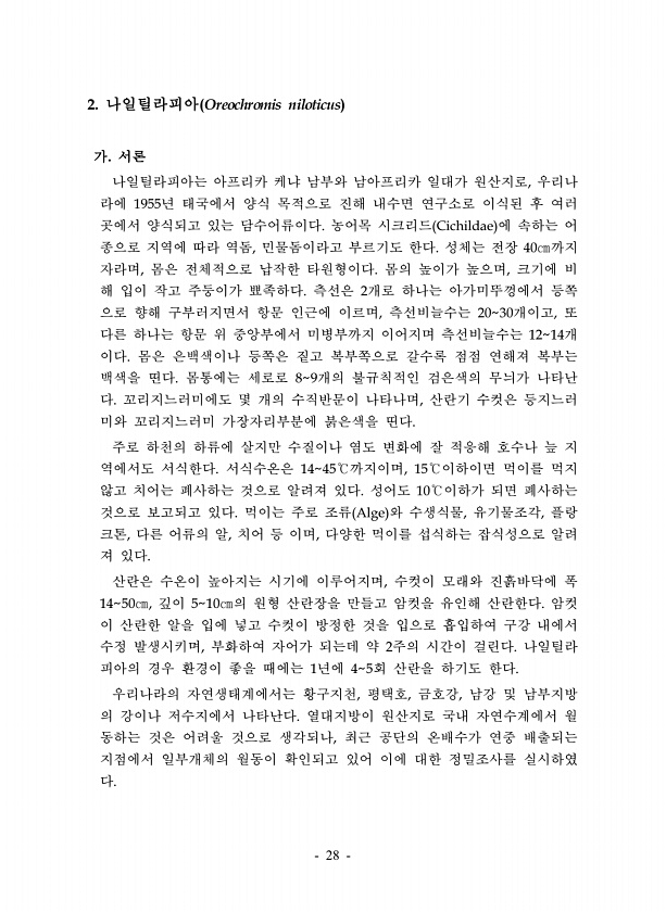 28 2. 나일틸라피아 Oreochromis niloticus 가. 서론 나일틸라피아는 아프리카 케냐 남부와 남아프리카 일대가 원산지로, 우리나 라에 1955년 태국에서 양식 목적으로 진해 내수면 연구소로 이식된 후 여러 곳에서 양식되고 있는 담수어류이다. 농어목 시크리드 Cichildae 에 속하는 어 종으로 지역에 따라 역돔, 민물돔이라고 부르기도 한다. 성체는 전장 40㎝까지 자라며, 몸은 전체적으로 납작한 타원형이다. 몸의 높이가 높으며, 크기에 비 해 입이 작고 주둥이가 뾰족하다. 측선은 2개로 하나는 아가미뚜껑에서 등쪽 으로 향해 구부러지면서 항문 인근에 이르며, 측선비늘수는 2030개이고, 또 다른 하나는 항문 위 중앙부에서 미병부까지 이어지며 측선비늘수는 1214개 이다. 몸은 은백색이나 등쪽...
