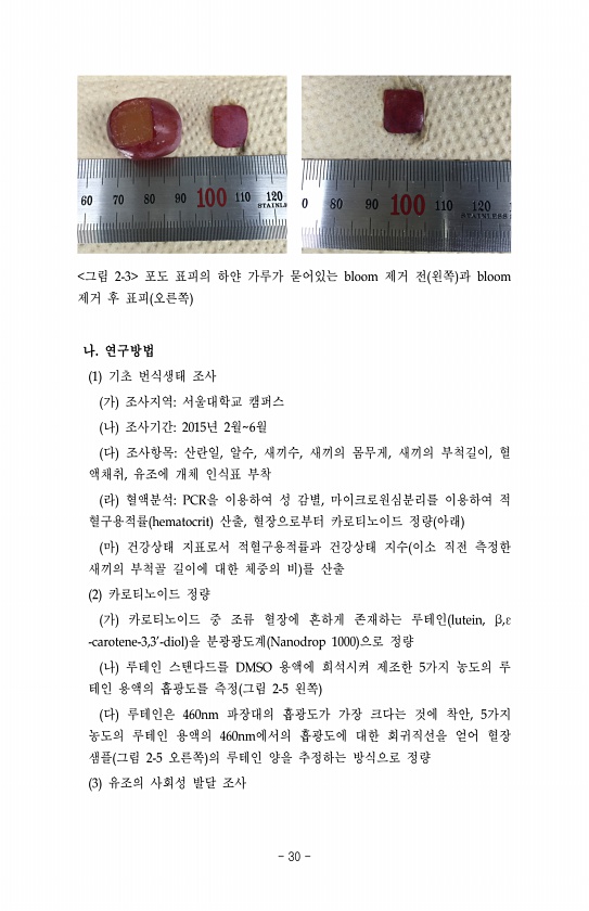 그림 2-3 포도 표피의 하얀 가루가 묻어있는 bloom 제거 전 왼쪽 과 bloom 제거 후 표피 오른쪽 나. 연구방법 1 기초 번식생태 조사 가 조사지역서울대학교 캠퍼스 나 조사기간2015년 2월6월 다 조사항목산란일, 알수, 새끼수, 새끼의 몸무게, 새끼의 부척길이, 혈 액채취, 유조에 개체 인식표 부착 라 혈액분석PCR을 이용하여 성 감별, 마이크로원심분리를 이용하여 적 혈구용적률 hematocrit 산출, 혈장으로부터 카로티노이드 정량 아래 마 건강상태 지표로서 적혈구용적률과 건강상태 지수 이소 직전 측정한 새끼의 부척골 길이에 대한 체중의 비 를 산출 2 카로티노이드 정량 가 카로티노이드 중 조류 혈장에 흔하게 존재하는 루테인 lutein, , -carotene-3,3-diol 을 분광광도계 Na...