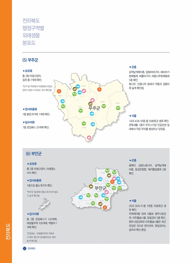 전라북도 52 전라북도 전라북도 행정구역별 외래생물 분포도 5 무주군 6 부안군 ?양서파충류 1종으로 황소개구리 확인. *부안군 일대에서 황소개구리의 밀도 가 높게 확인됨 ?양서파충류 1종 붉은귀거북 1개체 확인. ?담수어류 총 3종 큰입배스가 143개체, 파랑볼우럭 100개체, 떡붕어 1 개체 확인. *큰입배스, 파랑볼우럭의 개체수 가 매우 많으며 상대풍부도도 매우 높게 확인됨 ?포유류 총 2종 야생고양이, 야생염소 서식 확인. ?곤충 꽃매미, 남방노랑나비, 갈색날개매 미충, 등검은말벌, 돼지풀잎벌레 5종 확인. ?식물 26과 56속 61종 1변종 70분류군 생 육 확인. 주목해야할 외래 식물로 흰무늬엉겅 퀴, 자주풀솜나물, 창질경이 3종 확인. 흰무늬엉겅퀴와 자주풀솜나물은 최근 유입된 것으로 판단되며, ...