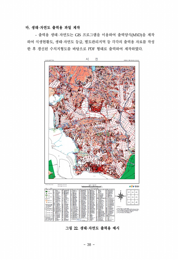 38 마. 생태·자연도 출력용 파일 제작 출력용 생태 자연도는 GIS 프로그램을 이용하여 출력양식 MXD 을 제작 하여 식생현황도, 생태·자연도 등급, 별도관리지역 등 각각의 출력용 자료를 작성 한 후 갱신된 수치지형도를 바탕으로 PDF 형태로 출력하여 제작하였다. 그림 22. 생태·자연도 출력용예시