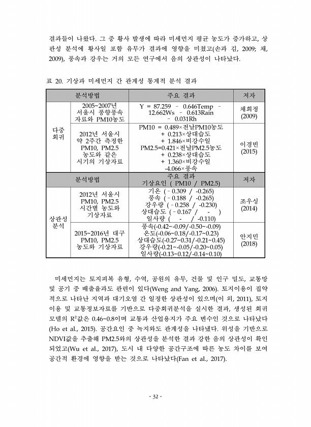 32 결과들이 나왔다 그 중 황사 발생에 따라 미세먼지 평균 농도가 증가하고 상 관성 분석에 황사일 포함 유무가 결과에 영향을 미쳤고 손과 김 채 풍속과 강우는 거의 모든 연구에서 음의 상관성이 나타났다 분석방법 주요 결과 저자 다중 회귀 년 서울시 풍향풍속 자료와 농도 채희정 년 서울시 약 주간 측정한 농도와 같은 시기의 기상자료 전날 농도 상대습도 비강수일 전날 농도 상대습도 비강수일 풍속 이경빈 분석방법 주요 결과 기상요인 저자 상관성 분석 년 서울시 시간별 농도와 기상자료 기온 풍속 강우량 상대습도 일사량 조우싱 년 대구 농도와 기상자료 풍속 온도 상대습도 강우량 일사량 안지민 표 기상과 미세먼지 간 관계성 통계적 분석 결과 미세먼지는 토지피복 유형 수역 공원의 유무 건물 및 인구 밀도 교통망 및 공...
