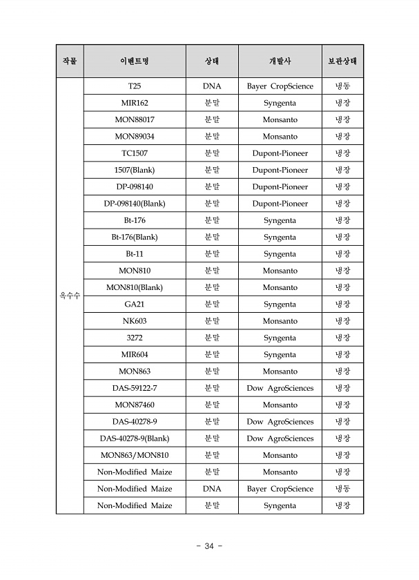 작물 이벤트명 상태 개발사 보관상태 옥수수 T25 DNA Bayer CropScience 냉동 MIR162 분말 Syngenta 냉장 MON88017 분말 Monsanto 냉장 MON89034 분말 Monsanto 냉장 TC1507 분말 Dupont-Pioneer 냉장 1507 Blank 분말 Dupont-Pioneer 냉장 DP-098140 분말 Dupont-Pioneer 냉장 DP-098140 Blank 분말 Dupont-Pioneer 냉장 Bt-176 분말 Syngenta 냉장 Bt-176 Blank 분말 Syngenta 냉장 Bt-11 분말 Syngenta 냉장 MON810 분말 Monsanto 냉장 MON810 Blank 분말 Monsanto 냉장 GA21 분말 Syngenta 냉장 NK603 분말...
