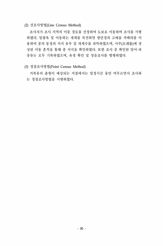 30 2 선조사방법 Line Census Method 조사자가 조사 지역의 이동 경로를 선정하여 도보로 이동하며 조사를 시행 하였다. 일광욕 및 이동하는 개체를 목견하면 쌍안경과 고배율 카메라를 이 용하여 종의 동정과 서식 유무 및 개체수를 파악하였으며, 사주 모래톱 에 생 성된 이동 흔적을 통해 종 서식을 확인하였다. 또한 조사 중 확인된 양서·파 충류는 모두 기록하였으며, 유생 확인 및 청음조사를 병행하였다. 3 정점조사방법 Point Census Method 거북류의 출현이 예상되는 지점에서는 일정시간 동안 머무르면서 조사하 는 정점조사방법을시행하였다.
