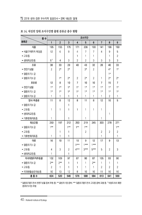 2018 생태·경관 우수지역 발굴조사 경북 내성천 일대 40 ? National Institute of Ecology 종 수 분류군 조사구간 1 2 3 4 5 6 7 8 9 식물 195 155 175 171 206 190 141 196 150 식물구계학적 특정종 12 6 9 4 7 7 4 9 5 고유종 1 1 1 1 2 생태계교란종 5† 4 3 2 2 3 3 3 3 조류 38 33 29 40 43 32 28 40 33 천연기념물 2 2* 2* 3* 2 4* 1* 멸종위기Ⅰ급 1* 멸종위기Ⅱ급 1* 2* 2 2* 2 1 2* 2* 포유류 12 8 10 7 10 10 7 15 7 천연기념물 1* 1* 1* 1* 1* 1* 1* 1* 1* 멸종위기Ⅰ급 1* 1* 1* 1* 1* 1* 1* 1* 1* 멸종위기Ⅱ급 ...