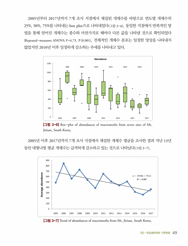 2장 육상생태계와 기후변화 49 2005년부터 2017년까지 7개 조사 지점에서 채집된 개체수를 바탕으로 연도별 개체수의 25%, 50%, 75%를 나타내는 box plot으로 나타내었다 그림 3-6 동일한 지점에서 반복적인 방 법을 통해 얻어진 개체수는 종수와 마찬가지로 해마다 다른 값을 나타낸 것으로 확인되었다 Repeated-measures ANOVA F=4.73, P 0.001 전체적인 개체수 분포는 일정한 양상을 나타내지 않았지만 2010년 이후 일정하게 감소하는 추세를 나타내고 있다. [그림 3-6] Box-plot of abundances of macromoths from seven sites of Mt. Jirisan, South Korea. 2005년 이후 2017년까지 7개 조사 지점에서 ...