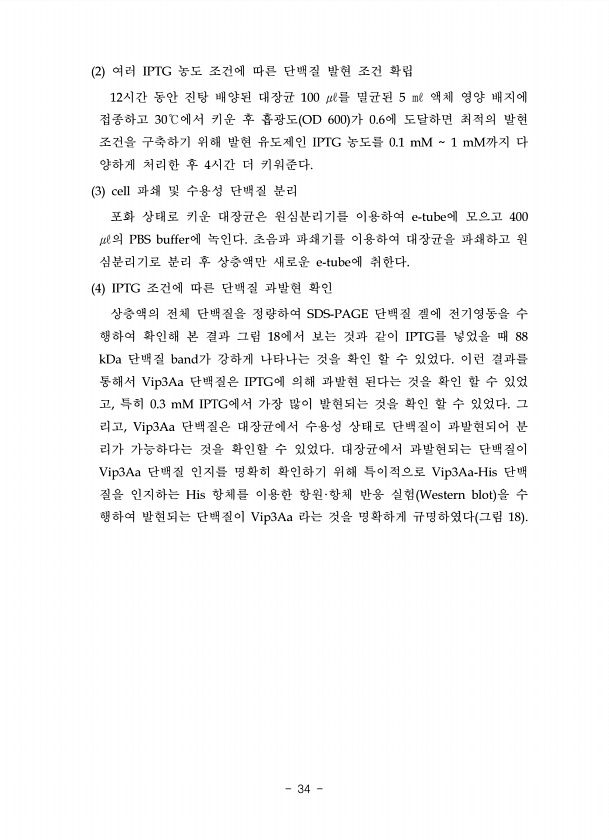2 여러 IPTG 농도 조건에 따른 단백질 발현 조건 확립 12시간 동안 진탕 배양된 대장균 100 ㎕를 멸균된 5 ㎖ 액체 영양 배지에 접종하고 30℃에서 키운 후 흡광도 OD 600 가 0.6에 도달하면 최적의 발현 조건을 구축하기 위해 발현 유도제인 IPTG 농도를 0.1 mM 1 mM까지 다 양하게 처리한 후 4시간 더 키워준다. 3 cell 파쇄 및 수용성 단백질 분리 포화 상태로 키운 대장균은 원심분리기를 이용하여 e-tube에 모으고 400 ㎕의 PBS buffer에 녹인다. 초음파 파쇄기를 이용하여 대장균을 파쇄하고 원 심분리기로 분리 후 상층액만 새로운 e-tube에 취한다. 4 IPTG 조건에 따른 단백질 과발현 확인 상층액의 전체 단백질을 정량하여 SDS-PAGE 단백질 겔에 전기영동을 ...