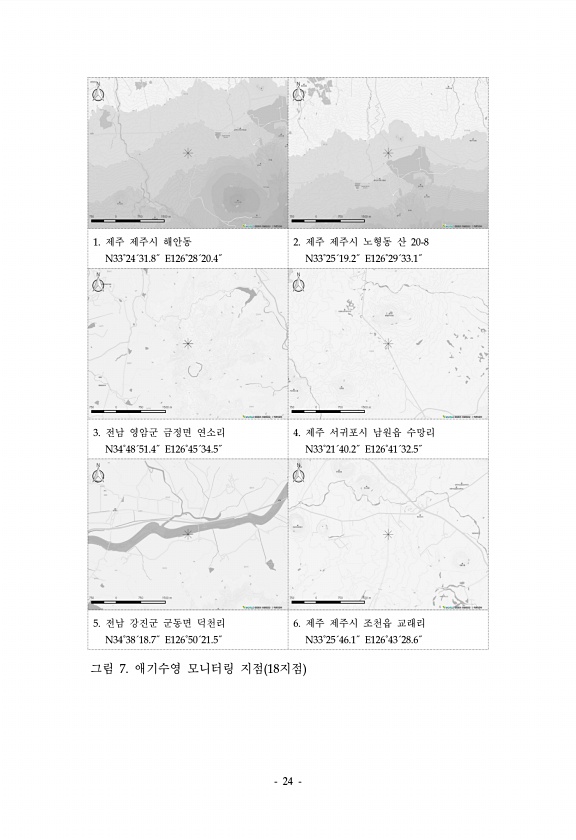 24 1. 제주 제주시 해안동 N33˚24´31.8˝ E126˚28´20.4˝ 2. 제주 제주시 노형동 산 20-8 N33˚25´19.2˝ E126˚29´33.1˝ 3. 전남 영암군 금정면 연소리 N34˚48´51.4˝ E126˚45´34.5˝ 4. 제주 서귀포시 남원읍 수망리 N33˚21´40.2˝ E126˚41´32.5˝ 5. 전남 강진군 군동면 덕천리 N34˚38´18.7˝ E126˚50´21.5˝ 6. 제주 제주시 조천읍 교래리 N33˚25´46.1˝ E126˚43´28.6˝ 그림 7. 애기수영 모니터링 지점 18지점