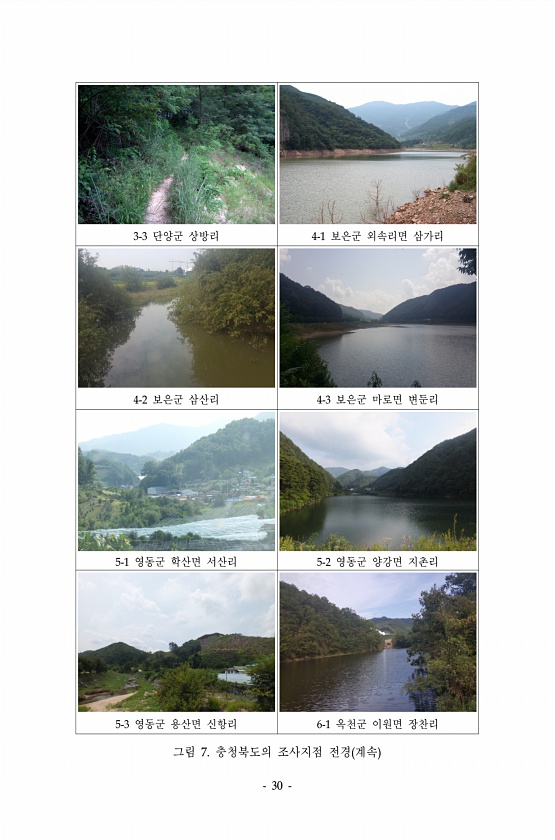 30 3-3 단양군 상방리 4-1 보은군 외속리면 삼가리 4-2 보은군 삼산리 4-3 보은군 마로면 변둔리 5-1 영동군 학산면 서산리 5-2 영동군 양강면 지촌리 5-3 영동군 용산면 신항리 6-1 옥천군 이원면 장찬리 그림 7. 충청북도의 조사지점 전경 계속