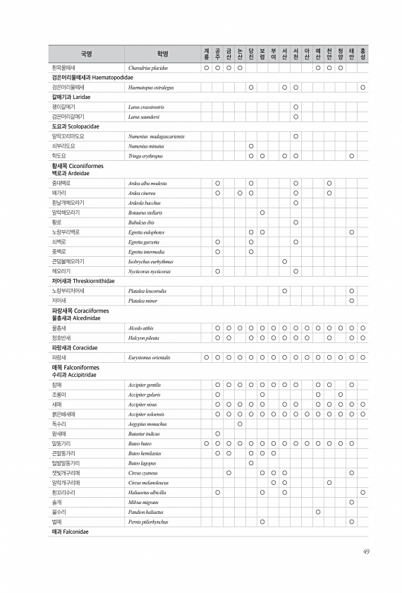 49 흰목물떼새 Charadrius placidus ○ ○ ○ ○ ○ ○ ○ 검은머리물떼새과 Haematopodidae 검은머리물떼새 Haematopus ostralegus ○ ○ ○ ○ 갈매기과 Laridae 괭이갈매기 Larus crassirostris ○ 검은머리갈매기 Larus saundersi ○ 도요과 Scolopacidae 알락꼬리마도요 Numenius madagascariensis ○ 쇠부리도요 Numenius minutus ○ 학도요 Tringa erythropus ○ ○ ○ ○ ○ 황새목 Ciconiiformes 백로과 Ardeidae 중대백로 Ardea alba modesta ○ ○ ○ ○ 왜가리 Ardea cinerea ○ ○ ○ ○ ○ 흰날개해오라기 Ardeola bacchus ○ 알...