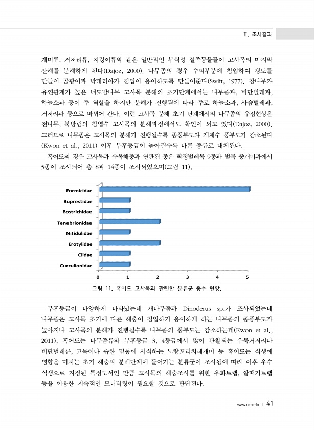 Ⅱ. 조사결과 www.nie.re.kr ? 41 개미류, 거저리류, 지렁이류와 같은 일반적인 부식성 절족동물들이 고사목의 마지막 잔해를 분해하게 된다 Dajoz, 2000 나무좀의 경우 수피부분에 침입하여 갱도를 만들어 곰팡이과 박테리아가 침입이 용이하도록 만들어준다 Swift, 1977 참나무와 유연관계가 높은 너도밤나무 고사목 분해의 초기단계에서는 나무좀과, 비단벌레과, 하늘소과 등이 주 역할을 하지만 분해가 진행됨에 따라 주로 하늘소과, 사슴벌레과, 거저리과 등으로 바뀌어 간다. 이런 고사목 분해 초기 단계에서의 나무좀의 우점현상은 전나무, 북방림의 침엽수 고사목의 분해과정에서도 확인이 되고 있다 Dajoz, 2000 그러므로 나무좀은 고사목의 분해가 진행될수록 종풍부도와 개체수 풍부도가 감소된다 Kw...