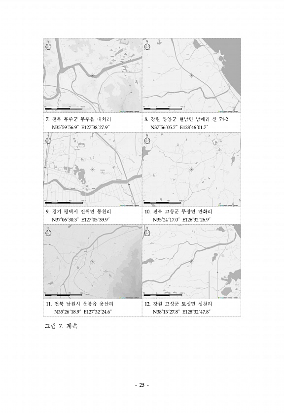 25 7. 전북 무주군 무주읍 대차리 N35˚59´56.9˝ E127˚38´27.9˝ 8. 강원 양양군 현남면 남애리 산 74-2 N37˚56´05.7˝ E128˚46´01.7˝ 9. 경기 평택시 진위면 동천리 N37˚06´30.3˝ E127˚05´39.9˝ 10. 전북 고창군 무장면 만화리 N35˚24´17.0˝ E126˚32´26.9˝ 11. 전북 남원시 운봉읍 용산리 N35˚26´18.9˝ E127˚32´24.6˝ 12. 강원 고성군 토성면 성천리 N38˚13´27.8˝ E128˚32´47.8˝ 그림 7.계속