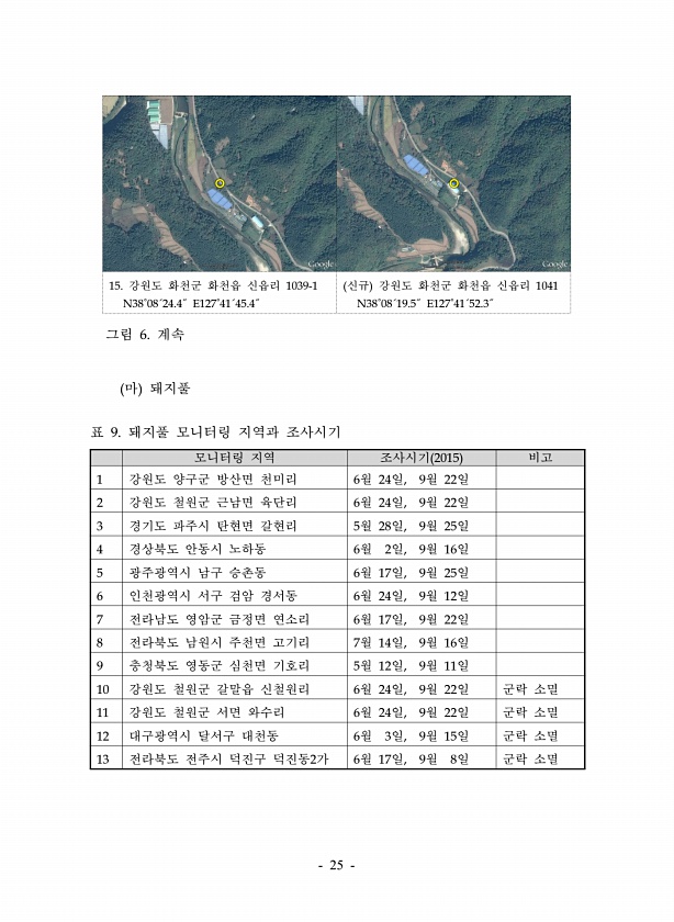 25 15. 강원도 화천군 화천읍 신읍리 1039-1 N38˚08´24.4˝ E127˚41´45.4˝ 신규 강원도 화천군 화천읍 신읍리 1041 N38˚08´19.5˝ E127˚41´52.3˝ 그림 6. 계속 마 돼지풀 모니터링 지역 조사시기 2015 비고 1 강원도 양구군 방산면 천미리 6월 24일, 9월 22일 2 강원도 철원군 근남면 육단리 6월 24일, 9월 22일 3 경기도 파주시 탄현면 갈현리 5월 28일, 9월 25일 4 경상북도 안동시 노하동 6월 2일, 9월 16일 5 광주광역시 남구 승촌동 6월 17일, 9월 25일 6 인천광역시 서구 검암 경서동 6월 24일, 9월 12일 7 전라남도 영암군 금정면 연소리 6월 17일, 9월 22일 8 전라북도 남원시 주천면 고기리 7월 14일, 9월 1...
