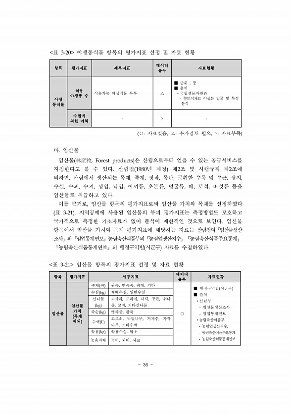 36 항목 평가지표 세부지표 데이터 유무 자료현황 임산물 임산물 가치 목재 제외 죽재 속 왕죽, 맹종죽, 솜대, 기타 ○ ■ 행정구역별 시군구 ■ 출처 ?산림청 임산물생산조사 임업통계연보 ?농림축산식품부 농림업생산지수, 농림축산식품주요통계 농림축산식품통계연보 수실 kg 재배수실, 일반수실 산나물 kg 고사리, 도라지, 더덕, 두릅, 취나 물, 고비, 기타산나물 죽순 kg 맹족중, 왕죽 수액 L 고로쇠, 박달나무, 거제수, 자작 나무, 기타수액 약용 kg 약용수실, 약초 농용자재 녹비, 퇴비, 사료 표 3-21 임산물 항목의 평가지표 선정 및 자료 현황 항목 평가지표 세부지표 데이터 유무 자료현황 야생 동식물 식용 야생종 수 식용가능 야생식물 목록 △ ■ 단위 종 ■ 출처 ?국립생물자원관 향토식재료 야생화 발...
