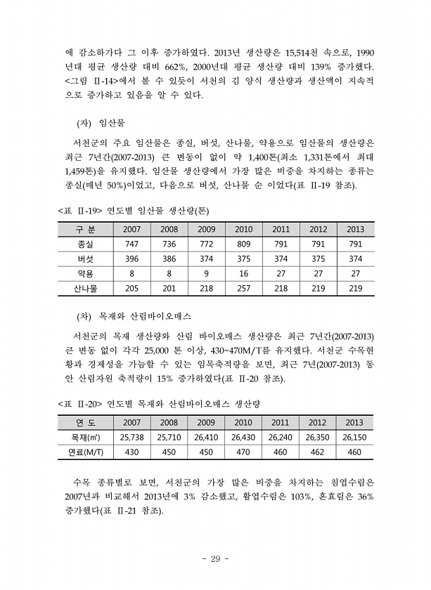 29 에 감소하가다 그 이후 증가하였다 년 생산량은 천 속으로 년대 평균 생산량 대비 년대 평균 생산량 대비 증가했다 그림 에서 볼 수 있듯이 서천의 김 양식 생산량과 생산액이 지속적 으로 증가하고 있음을 알 수 있다 자 임산물 서천군의 주요 임산물은 종실 버섯 산나물 약용으로 임산물의 생산량은 최근 년간 큰 변동이 없이 약 톤 최소 톤에서 최대 톤 을 유지했다 임산물 생산량에서 가장 많은 비중을 차지하는 종류는 종실 매년 이었고 다음으로 버섯 산나물 순 이었다 표 참조 구 분 2007 2008 2009 2010 2011 2012 2013 종실 747 736 772 809 791 791 791 버섯 396 386 374 375 374 375 374 약용 8 8 9 16 27 27 27 산나물 205 201 ...
