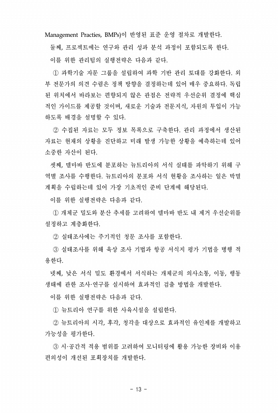 Management Practies, BMPs 이 반영된 표준 운영 절차로 개발한다. 둘째, 프로젝트에는 연구와 관리 성과 분석 과정이 포함되도록 한다. 이를 위한 관리팀의 실행전략은 다음과 같다. ① 과학기술 자문 그룹을 설립하여 과학 기반 관리 토대를 강화한다. 외 부 전문가의 의견 수렴은 정책 방향을 결정하는데 있어 매우 중요하다. 독립 된 위치에서 바라보는 편향되지 않은 관점은 전략적 우선순위 결정에 핵심 적인 가이드를 제공할 것이며, 새로운 기술과 전문지식, 자원의 투입이 가능 하도록 배경을 설명할 수 있다. ② 수집된 자료는 모두 정보 목록으로 구축한다. 관리 과정에서 생산된 자료는 현재의 상황을 진단하고 미래 발생 가능한 상황을 예측하는데 있어 소중한 자산이 된다. 셋째, 델마바 반도에 분포하는...
