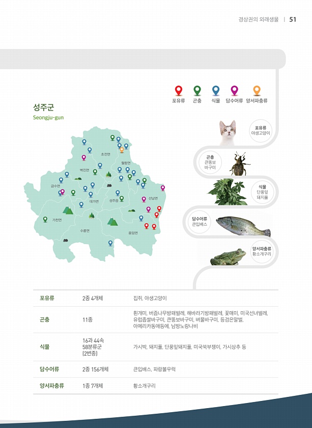 포유류 야생고양이 담수어류 큰입배스 양서파충류 황소개구리 성주군 Seongju-gun 수륜면 용암면 가천면 금수면 벽진면 초전면 월항면 선남면 대가면 성주읍 포유류 2종 4개체 집쥐, 야생고양이 곤충 11종 흰개미, 버즘나무방패벌레, 해바라기방패벌레, 꽃매미, 미국선녀벌레, 유럽좁쌀바구미, 큰뚱보바구미, 벼물바구미, 등검은말벌, 아메리카동애등에, 남방노랑나비 식물 16과 44속 58분류군 2변종 가시박, 돼지풀, 단풍잎돼지풀, 미국쑥부쟁이, 가시상추 등 담수어류 2종 156개체 큰입배스, 파랑볼우럭 양서파충류 1종 7개체 황소개구리 포유류 곤충 식물 담수어류 양서파충류 식물 단풍잎 돼지풀 곤충 큰뚱보 바구미 경상권의 외래생물51