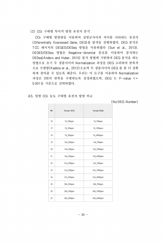 35 2 CO2 구배별 특이적 발현 유전자 분석 CO2 구배별 발현량을 이용하여 실험군사이의 차이를 나타내는 유전자 Diferentially Expressed Gene, DEG 를 탐색을 진행하였다. DEG 분석은 T CC 패키지의 DEGES/DESeq 방법을 이용하였다 Sun et al., 2013 DEGES/DESeq 방법은 Negative- binomial 분포를 이용하여 분석하는 DESeq Anders and Huber, 2010 분석 방법에 기반하여 DEG 분석을 하는 방법으로 초기 두 샘플사이의 Normalization 과정을 DEG 고려하여 반복적 으로 수행함 Kadota et al., 2012 으로써 두 샘플사이의 DEG 를 좀 더 정확 하게 찾아줄 수 있도록 해준다. 우리는 이 도구를 이용하...