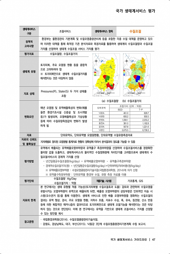 국가 생태계서비스 평가 국가 생태계서비스 가이드라인 ┃ 47 생태계서비스 구분 조절서비스 생태계서비스 항목 수질조절 정책적 고려사항 환경부는 물환경관리 기본계획 및 수질오염총량관리제 등을 포함한 각종 수질 대책을 운영하고 있으 며 이러한 대책을 통해 축적된 기존 분석자료와 측정자료를 활용하여 생태계의 수질조절량과 수질조절 가치를 산정하여 생태계 수질조절 서비스 가치를 평가 평가지표 수질조절량, 수질조절가치 a 수질조절량 b 수질조절가치 단위유역 조절가치 단위 억원 BOD T-P 낙본A 461.0 629.7 낙본B 600.2 930.5 반변A 1,094.1 2,255.2 용전A 381.0 1,182.8 길안A 507.8 1,221.6 낙본C 3,075.5 6,739.3 생태계 유형 토지피복, 주요 오염원 현황...