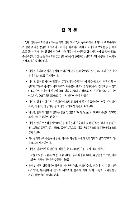 생태·경관우수지역 발굴조사는 지형·경관 및 식생이 우수하거나 생태적으로 보존가치 가 높은 지역을 발굴해 보호지역으로 지정·관리하기 위한 기초자료 확보하는 것을 목적 으로 한다. 경북 내성천 일대 영주댐 기준 하류부터 낙동강 합수지점까지 총 길이 56㎞, 수변폭양안 100m 을 대상으로 2018년 6월부터 2019년 4월까지 9개 분류군, 34계절 현장조사가 수행되었다. ? 내성천 유역의 지질은 중생대 쥐라기에 관입된 화강암류가 56.33%, 소백산 편마암 류가 31.42%를 차지하였다. ? 내성천 일대 토지피복 변화는 1971년에는 수역과 나지 사주 96.3% , 경작지 등 식 생역 3.7% 로 수역과 나지사주가 대부분이었으나 1988년부터 경작지등 식생역 11.2% 이 증가하기 시작해 2011년 23.2%...