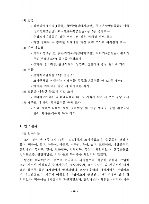 iii 3 곤충 갈색날개매미충 1등급 , 꽃매미 생태계교란 , 등검은말벌 1등급 , 미국 선녀벌레 2등급 , 미국흰불나방 2등급 등 5종 중점조사 중점조사대상종의 집중 서식지의 경우 위해성 정보 확보 자연 생태계 내 정착한 외래생물 대상 포획 조사로 서식실태 조사 4 양서·파충류 늑대거북 2등급 , 붉은귀거북속 생태계교란 , 악어거북 2등급 , 황소개 구리 생태계교란 등 4종 중점조사 생태적 중요지점, 집단서식지, 동면지, 산란지의 경우 별도로 기록 5 식물 생태계교란식물 12종 중점조사 조사구역별 야생하는 외래식물 목록화 귀화식물 약 320종 대상 미기록 귀화식물 발견 시 확증표본 작성 6 드론을 이용한 분포지 정밀 조사 생태계교란식물 및 외래식물의 대규모 서식지 발견 시 분포 경향 조사 7 제주도 내 유...