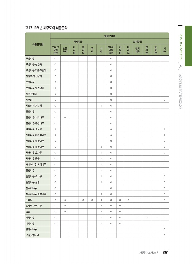 표 17. 1989년 제주도의 식물군락 식물군락명 행정구역명 북제주군 남제주군 한라산 국립 공원 산굼 부리 비자림 추자도 우도 기타 한라산 국립 공원 산방산 마라도 안덕 계곡 천지연 효둔천 기타 구상나무 ○ ○ 구상나무-산철쭉 ○ ○ 구상나무-제주조릿대 ○ ○ 산철쭉-털진달래 ○ ○ 눈향나무 ○ ○ 눈향나무-털진달래 ○ ○ 제주조릿대 ○ ○ 시로미 ○ ○ ○ 시로미-산겨이삭 ○ ○ ○ 물참나무 ○ ○ 물참나무-서어나무 ○ ○ ○ 물참나무-구상나무 ○ ○ ○ 물참나무-소나무 ○ ○ ○ 서어나무-개서어나무 ○ ○ ○ 서어나무-졸참나무 ○ ○ ○ 서어나무-물참나무 ○ ○ ○ ○ 서어나무-소나무 ○ ○ ○ ○ 서어나무-곰솔 ○ ○ ○ ○ 개서어나무-서어나무 ○ ○ ○ ○ 졸참나무 ○ ○ ○ ○ 졸참나무-소나무 ○ ...