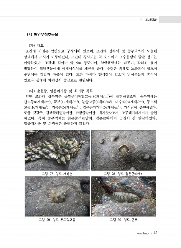 Ⅱ. 조사결과 www.nie.re.kr ? 41 5 해안무척추동물 가 개요 조간대 기질은 암반으로 구성되어 있으며, 조간대 상부역 및 중부역까지 노출된 상태에서 조사가 이루어졌다. 조간대 경사도는 약 60도이며 조수웅덩이 발달 정도는 미약하였다. 조간대 길이는 약 5m 정도이며, 암반표면에는 타포니, 갈라진 틈이 발달하여 해양생물에게 미세서식처를 제공해 준다. 주변은 외해로 노출되어 있으며 주변에는 갯벌과 마을이 없다. 또한 다시마 양식장이 있으며 낚시꾼들의 흔적이 있으나 생태계 자연성이 중급으로 판단된다. 나 출현종, 멸종위기종 및 희귀종 목록 암반 조간대 상부역은 좁쌀무늬총알고둥 80개체/m2 이 출현하였으며, 중부역에는 갈고둥 8개체/m2 , 군부 12개체/m2 , 눈알고둥 4개체/m2 , 대수리 84...