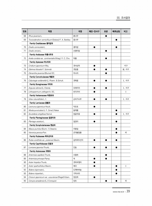 III. 조사결과 www.nie.re.kr ? 39 번호 학명 국명 해빈-전사구 초본 배후삼림 비고 68 Rhus javanica L. 붉나무 ● 69 Toxicodendron vernicifluum Stokes F. A. Barkley 옻나무 ● Family Oxalidaceae 괭이밥과 70 Oxalis corniculata L. 괭이밥 ● ● 71 Oxalis stricta L. 선괭이밥 ● Family Araliaceae 두릅나무과 72 Aralia cordata var. continentalis Kitag. Y. C. Chu 독활 ● Family Apiaceae 미나리과 73 Cnidium japonicum Miq. 갯사상자 ● 사구 74 Glehnia littoralis F. Schmidt 갯방풍...