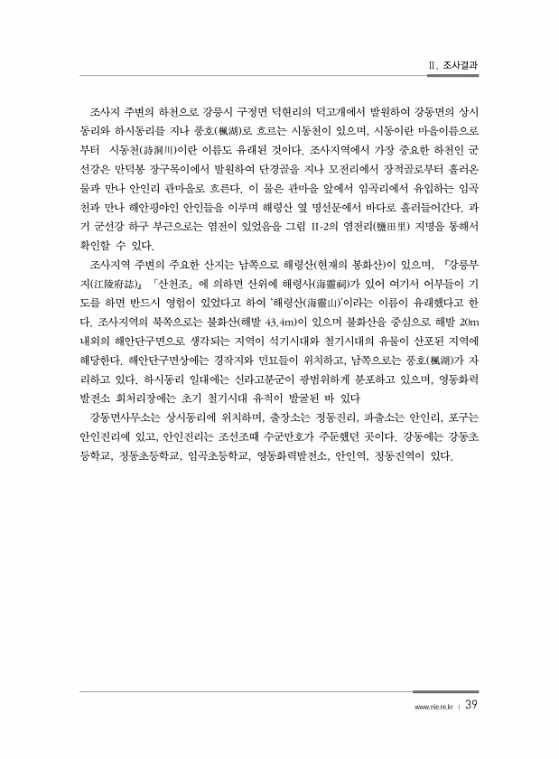 Ⅱ. 조사결과 www.nie.re.kr ? 39 조사지 주변의 하천으로 강릉시 구정면 덕현리의 덕고개에서 발원하여 강동면의 상시 동리와 하시동리를 지나 풍호 楓湖 로 흐르는 시동천이 있으며, 시동이란 마을이름으로 부터 시동천 詩洞川 이란 이름도 유래된 것이다. 조사지역에서 가장 중요한 하천인 군 선강은 만덕봉 장구목이에서 발원하여 단경골을 지나 모전리에서 장적골로부터 흘러온 물과 만나 안인리 관마을로 흐른다. 이 물은 관마을 앞에서 임곡리에서 유입하는 임곡 천과 만나 해안평야인 안인들을 이루며 해령산 옆 명선문에서 바다로 흘러들어간다. 과 거 군선강 하구 부근으로는 염전이 있었음을 그림 Ⅱ-2의 염전리 鹽田里 지명을 통해서 확인할 수 있다. 조사지역 주변의 주요한 산지는 남쪽으로 해령산 현재의 봉화산 이 있...