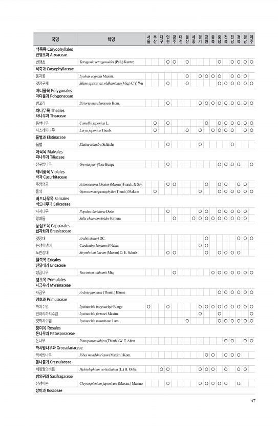 47 석죽목 Caryophyllales 번행초과 Aizoaceae 번행초 Tetragonia tetragonoides Pall. Kuntze ○ ○ ○ ○ ○ ○ ○ ○ 석죽과 Caryophyllaceae 동자꽃 Lychnis cognata Maxim. ○ ○ ○ ○ ○ ○ ○ ○ 갯장구채 Silene aprica var. oldhamiana Miq. C.Y. Wu ○ ○ ○ ○ ○ ○ ○ ○ 마디풀목 Polygonales 마디풀과 Polygonaceae 범꼬리 Bistorta manshuriensis Kom. ○ ○ ○ ○ ○ ○ ○ ○ ○ ○ 차나무목 Theales 차나무과 Theaceae 동백나무 Camellia japonica L. ○ ○ ○ ○ ○ ○ ○ ○ ○ 사스레피나무 Eurya japonic...