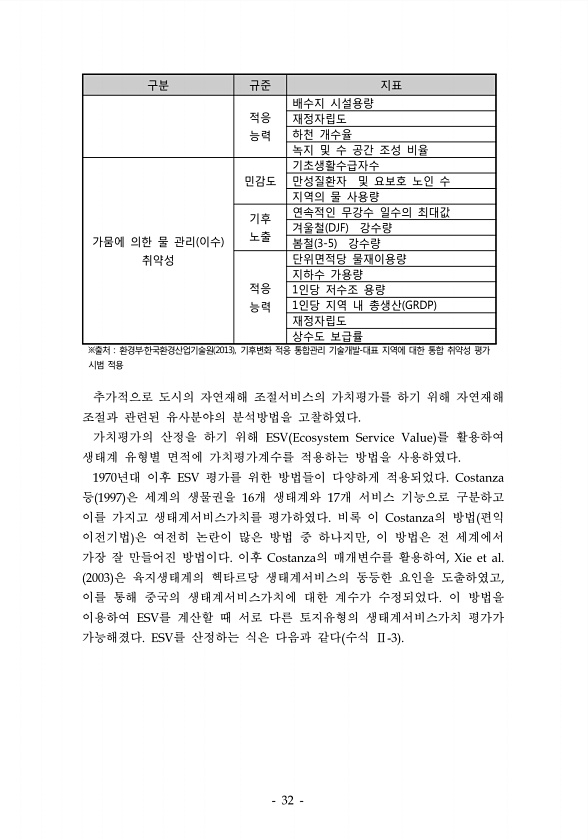 구분 규준 지표 적응 능력 배수지 시설용량 재정자립도 하천 개수율 녹지 및 수 공간 조성 비율 가뭄에 의한 물 관리 이수 취약성 민감도 기초생활수급자수 만성질환자 및 요보호 노인 수 지역의 물 사용량 기후 노출 연속적인 무강수 일수의 최대값 겨울철 DJF 강수량 봄철 3-5 강수량 적응 능력 단위면적당 물재이용량 지하수 가용량 1인당 저수조 용량 1인당 지역 내 총생산 GRDP 재정자립도 상수도 보급률 ※출처 환경부·한국환경산업기술원 2013 , 기후변화 적응 통합관리 기술개발-대표 지역에 대한 통합 취약성 평가 시범 적용 추가적으로 도시의 자연재해 조절서비스의 가치평가를 하기 위해 자연재해 조절과 관련된 유사분야의 분석방법을 고찰하였다 가치평가의 산정을 하기 위해 를 활용하여 생태계 유형별 면적에 가치평가...