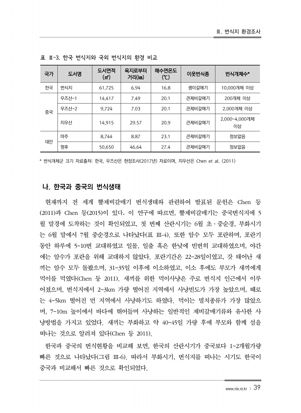 Ⅲ. 번식지 환경조사 www.nie.re.kr ? 39 국가 도서명 도서면적 ㎡ 육지로부터 거리 ㎞ 해수면온도 ℃ 이웃번식종 번식개체수* 한국 번식지 61,725 6.94 16.8 괭이갈매기 10,000개체 이상 중국 우즈산-1 14,417 7.49 20.1 큰제비갈매기 200개체 이상 우즈산-2 9,724 7.03 20.1 큰제비갈매기 2,000개체 이상 지우산 14,915 29.57 20.9 큰제비갈매기 2,0004,000개체 이상 대만 마주 8,744 8.87 23.1 큰제비갈매기 정보없음 펑후 50,650 46.64 27.4 큰제비갈매기 정보없음 표 Ⅲ-3. 한국 번식지와 국외 번식지의 환경 비교 * 번식개체군 크기 자료출처한국, 우즈산은 현장조사 2017년 자료이며, 지우산은 Chen et al....