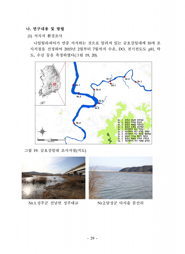 29 Nr.1.성주군 선남면 성주대교 Nr.2.달성군 다사읍 문산리 나. 연구내용 및 방법 1 서식지 환경조사 나일틸라피아가 연중 서식하는 것으로 알려져 있는 금호강일대에 10개 조 사지점을 선정하여 2015년 2월부터 7월까지 수온, DO, 전기전도도 pH, 탁 도, 수심 등을 측정하였다 그림 19, 20 그림 19. 금호강일대 조사지점 지도