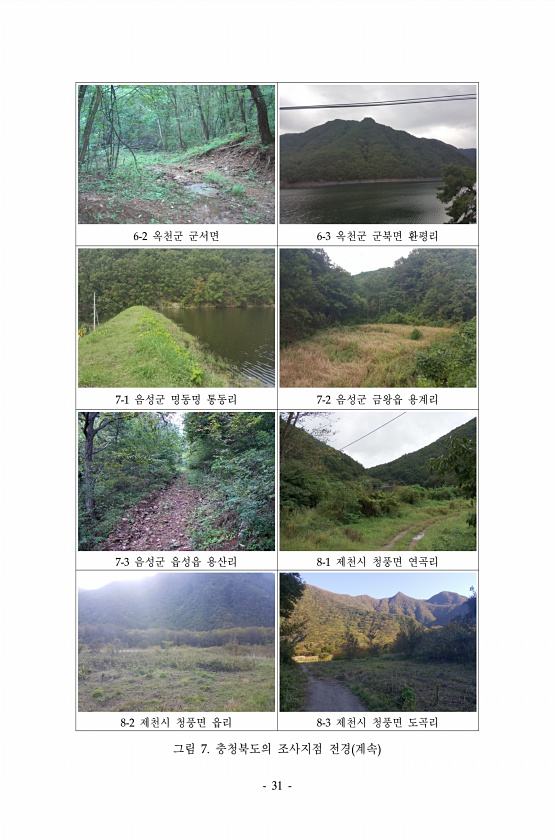 31 6-2 옥천군 군서면 6-3 옥천군 군북면 환평리 7-1 음성군 명동명 통동리 7-2 음성군 금왕읍 용계리 7-3 음성군 읍성읍 용산리 8-1 제천시 청풍면 연곡리 8-2 제천시 청풍면 읍리 8-3 제천시 청풍면 도곡리 그림 7. 충청북도의 조사지점 전경 계속