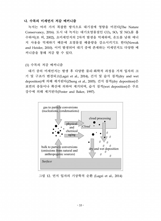 33 나 수목의 미세먼지 저감 메커니즘 녹지는 여러 가지 복잡한 방식으로 대기질에 영향을 미친다 도시 내 녹지는 대기오염물질인 및 를 흡 수하여 조 외 초미세먼지의 차적 발생을 억제하며 온도를 낮춰 에너 지 사용을 억제하기 때문에 오염물질 배출량을 감소시키기도 한다 이미 발생되어 대기 중에 존재하는 미세먼지도 다양한 메 커니즘을 통해 저감 할 수 있다 수목의 저감 메커니즘 대기 중의 미세먼지는 발생 후 다양한 물리 화학적 과정을 거쳐 입자의 크 기 및 구조가 변경되고 건식 및 습식 침적 에 의해 제거된다 건식 침적 은 표면의 충돌이나 확산에 의하여 제거되며 습식 침적 은 주로 강수에 의해 제거된다 그림 먼지 입자의 기상학적 순환 33