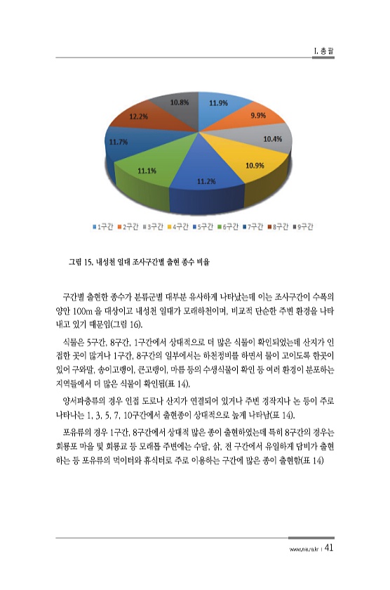 I. 총 괄 www.nie.re.kr ? 41 그림 15. 내성천 일대 조사구간별 출현 종수 비율 구간별 출현한 종수가 분류군별 대부분 유사하게 나타났는데 이는 조사구간이 수폭의 양안 100m 을 대상이고 내성천 일대가 모래하천이며, 비교적 단순한 주변 환경을 나타 내고 있기 때문임 그림 16 식물은 5구간, 8구간, 1구간에서 상대적으로 더 많은 식물이 확인되었는데 산지가 인 접한 곳이 많거나 1구간, 8구간의 일부에서는 하천정비를 하면서 물이 고이도록 한곳이 있어 구와말, 송이고랭이, 큰고랭이, 마름 등의 수생식물이 확인 등 여러 환경이 분포하는 지역들에서 더 많은 식물이 확인됨 표 14 양서파충류의 경우 인접 도로나 산지가 연결되어 있거나 주변 경작지나 논 등이 주로 나타나는 1, 3, 5, 7, 10...