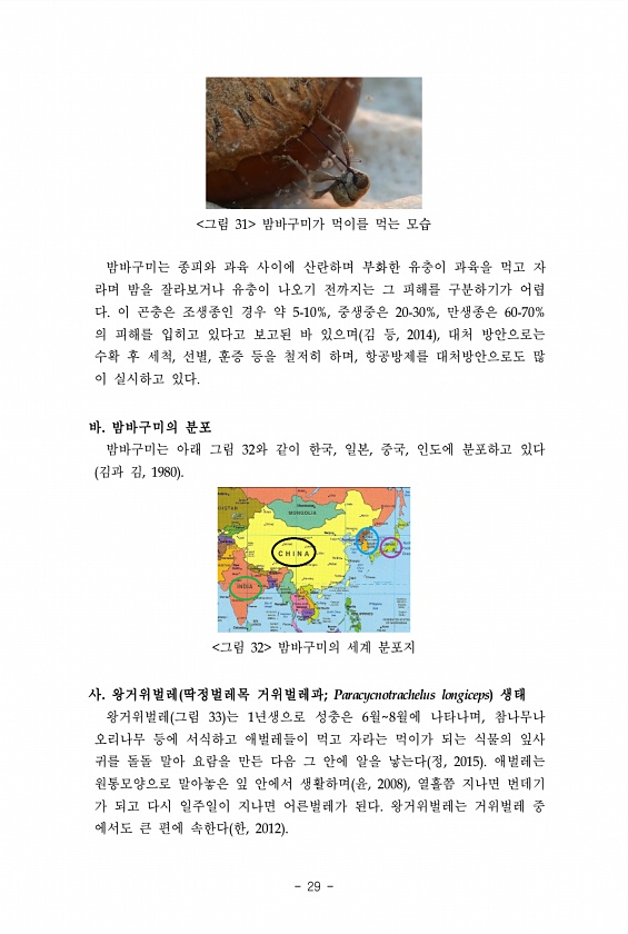 29 그림 31 밤바구미가 먹이를 먹는 모습 밤바구미는 종피와 과육 사이에 산란하며 부화한 유충이 과육을 먹고 자 라며 밤을 잘라보거나 유충이 나오기 전까지는 그 피해를 구분하기가 어렵 다. 이 곤충은 조생종인 경우 약 5-10%, 중생중은 20-30%, 만생종은 60-70% 의 피해를 입히고 있다고 보고된 바 있으며 김 등, 2014 , 대처 방안으로는 수확 후 세척, 선별, 훈증 등을 철저히 하며, 항공방제를 대처방안으로도 많 이 실시하고 있다. 바. 밤바구미의 분포 밤바구미는 아래 그림 32와 같이 한국, 일본, 중국, 인도에 분포하고 있다 김과 김, 1980 그림 32 밤바구미의 세계 분포지 사. 왕거위벌레 딱정벌레목 거위벌레과; Paracycnotrachelus longiceps 생태 왕거위벌레 그...