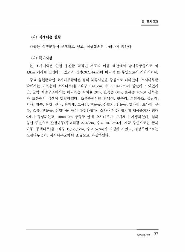 Ⅱ. 조사결과 www.nie.re.kr ? 37 다 식생훼손 현황 다양한 식생군락이 분포하고 있고, 식생훼손은 나타나지 않았다. 라 특기사항 본 조사지역은 인천 옹진군 덕적면 서포리 마을 해안에서 남서쪽방향으로 약 13km 거리에 인접하고 있으며 면적 382,314㎡ 이 비교적 큰 무인도로서 사유지이다. 주요 출현군락인 소사나무군락은 섬의 북쪽사면을 중심으로 나타났다. 소사나무군 락에서는 교목층에 소사나무 흉고직경 18-15cm, 수고 10-12m 가 발달하고 있었지 만, 군락 계층구조에서는 아교목층 식피율 30%, 관목층 60%, 초본층 70%로 관목층 과 초본층의 식생이 발달하였다. 초본층에서는 천남성, 원추리, 그늘사초, 둥글레, 억새, 참쑥, 참취, 산국, 참억새, 고사리, 맥문동, 산딸기, 천문동,...