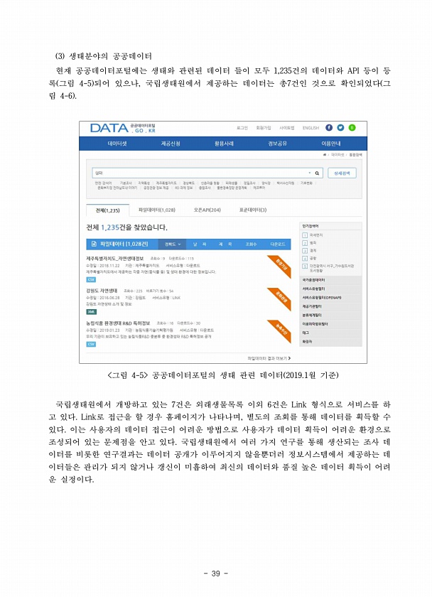 39 3 생태분야의 공공데이터 현재 공공데이터포털에는 생태와 관련된 데이터 들이 모두 1,235건의 데이터와 API 등이 등 록 그림 4-5 되어 있으나, 국립생태원에서 제공하는 데이터는 총7건인 것으로 확인되었다 그 림 4-6 그림 4-5 공공데이터포털의 생태 관련 데이터 2019.1월 기준 국립생태원에서 개방하고 있는 7건은 외래생물목록 이외 6건은 Link 형식으로 서비스를 하 고 있다. Link로 접근을 할 경우 홈페이지가 나타나며, 별도의 조회를 통해 데이터를 획득할 수 있다. 이는 사용자의 데이터 접근이 어려운 방법으로 사용자가 데이터 획득이 어려운 환경으로 조성되어 있는 문제점을 안고 있다. 국립생태원에서 여러 가지 연구를 통해 생산되는 조사 데 이터를 비롯한 연구결과는 데이터 공개가 이루어지지...