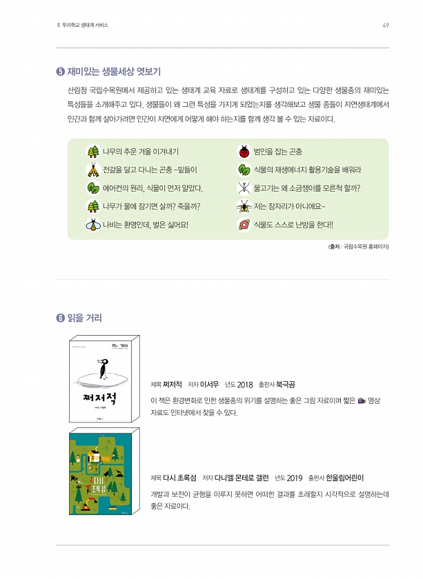? 재미있는 생물세상 엿보기 산림청 국립수목원에서 제공하고 있는 생태계 교육 자료로 생태계를 구성하고 있는 다양한 생물종의 재미있는 특성들을 소개해주고 있다. 생물들이 왜 그런 특성을 가지게 되었는지를 생각해보고 생물 종들이 자연생태계에서 인간과 함께 살아가려면 인간이 자연에게 어떻게 해야 하는지를 함께 생각 볼 수 있는 자료이다. 나무의 추운 겨울 이겨내기 범인을 잡는 곤충 전갈을 달고 다니는 곤충 -밑들이 식물의 재생에너지 활용기술을 배워라 에어컨의 원리, 식물이 먼저 알았다. 물고기는 왜 소금쟁이를 모른척 할까? 나무가 물에 잠기면 살까? 죽을까? 저는 잠자리가 아니에요나비는 환영인데, 벌은 싫어요! 식물도 스스로 난방을 한다!! 출처 국립수목원 홈페이지 ? 읽을 거리 제목 쩌저적 저자 이서우 년도 2...