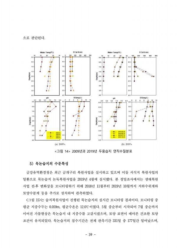 39 으로 판단된다. a 2009‘s b 2019‘s 그림 14 2009년과 2019년 두웅습지 연직수질분포 5 묵논습지의 수문특성 금강유역환경청은 최근 금개구리 복원사업을 실시하고 있으며 이들 서식지 복원사업의 일환으로 묵논습지 논둑복원사업을 2019년 4월에 실시했다. 본 정밀조사에서는 생태복원 사업 전?후 변화상을 모니터링하기 위해 2018년 11월부터 2019년 10월까지 지하수위계와 토양수분계 등을 추가로 설치하여 관측하였다. 그림 15 는 습지복원사업이 진행된 묵논습지의 실시간 모니터링 결과이다. 모니터링 중 평균 지중수두는 0.059m, 평균수온은 12.0℃이였다. 5월 중순부터 시작되어 7월 중순까지 이어진 가뭄현상은 묵논습지 내 지중수를 고갈시켰으며, 토양 표면이 매마른 건조한 토양 조건이 ...