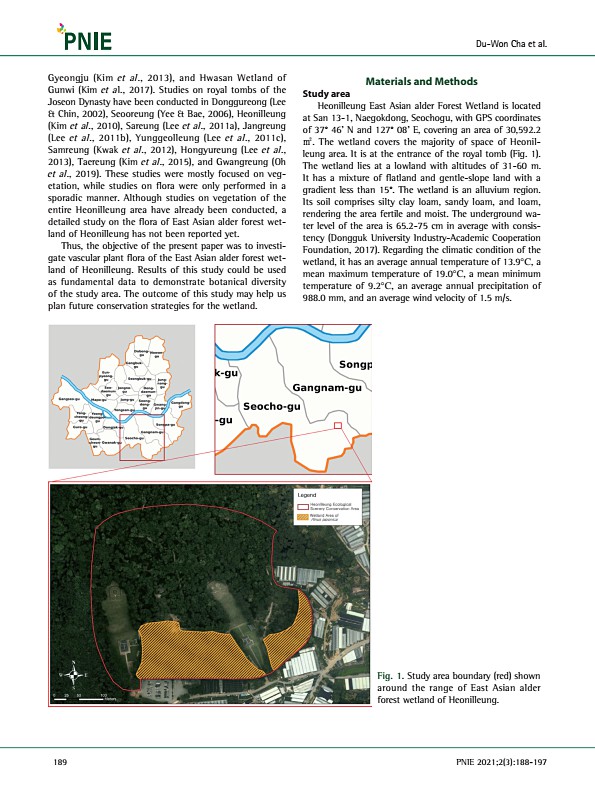 Materials and Methods Study area Heonilleung East Asian alder Forest Wetland is located at San 13-1, Naegokdong, Seochogu, with GPS coordinates of 37° 46’ N and 127° 08’ E, covering an area of 30,592.2 ㎡. The wetland covers the majority of space of Heonilleung area. It is at the entrance of the royal tomb Fig. 1 The wetland lies at a lowland with altitudes of 31-60 m. It has a mixture of flatland ...