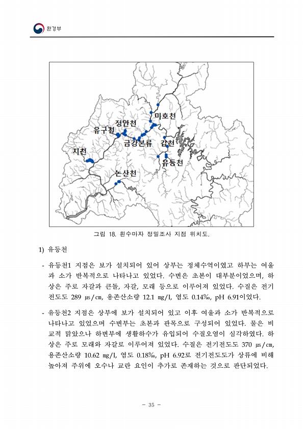 35 그림 18. 흰수마자 정밀조사 지점 위치도. 1 유등천 유등천1 지점은 보가 설치되어 있어 상부는 정체수역이였고 하부는 여울 과 소가 반복적으로 나타나고 있었다. 수변은 초본이 대부분이었으며, 하 상은 주로 자갈과 큰돌, 자갈, 모래 등으로 이루어져 있었다. 수질은 전기 전도도 289 ㎲/㎝, 용존산소량 12.1 ㎎/l, 염도 0.14‰, pH 6.91이었다. 유등천2 지점은 상부에 보가 설치되어 있고 이후 여울과 소가 반복적으로 나타나고 있었으며 수변부는 초본과 관목으로 구성되어 있었다. 물은 비 교적 맑았으나 하변부에 생활하수가 유입되어 수질오염이 심각하였다. 하 상은 주로 모래와 자갈로 이루어져 있었다. 수질은 전기전도도 370 ㎲/㎝, 용존산소량 10.62 ㎎/l, 염도 0.18‰, pH 6.9...