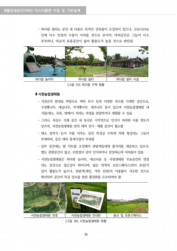 생물공생공간 야외 마스터플랜 수립 및 기본설계 36 하다람 쉼터는 공간 내 다용도 목적인 건축물이 조성되어 있으나, 코로나19로 인해 다수 인원의 수용이 어려울 것으로 보이며, 야외공간은 그늘이 다소 부족하나, 비교적 유휴공간이 넓어 활용도가 높을 것으로 판단됨 하다람 놀이터 하다람 쉼터 하다람 쉼터 시설 [그림 35] 하다람 구역 현황 ?서천농업생태원 서천군의 환경을 바탕으로 벼와 모시 등과 다양한 과수를 식재한 공간으로, 수양뽕나무, 매실나무, 꾸찌뽕나무, 대추나무 등이 있으며 서천농업생태원 내 식물 채소, 곡류, 열매 이 자라는 과정을 관찰하거나 체험할 수 있음 그러나, 과실수 식재 공간 내 동선은 시각적으로 인식이 어려워 이용 빈도가 낮으며, 서천농업생태원 면적 대비 전시ㆍ체험 공간이 협소함 채소 경...