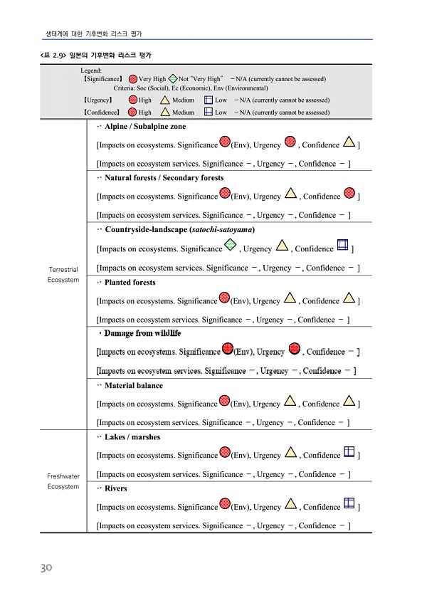 생태계에 대한 기후변화 리스크 평가 30 Legend【Significance】 Very High Not “Very High” -N/A currently cannot be assessed CriteriaSoc Social , Ec Economic , Env Environmental 【Urgency】 High Medium Low -N/A currently cannot be assessed 【Confidence】 High Medium Low -N/A currently cannot be assessed Terrestrial Ecosystem ? Alpine Subalpine zone [Impacts on ecosystems. Significance Env , Urgency , Confidence ] [Impacts...