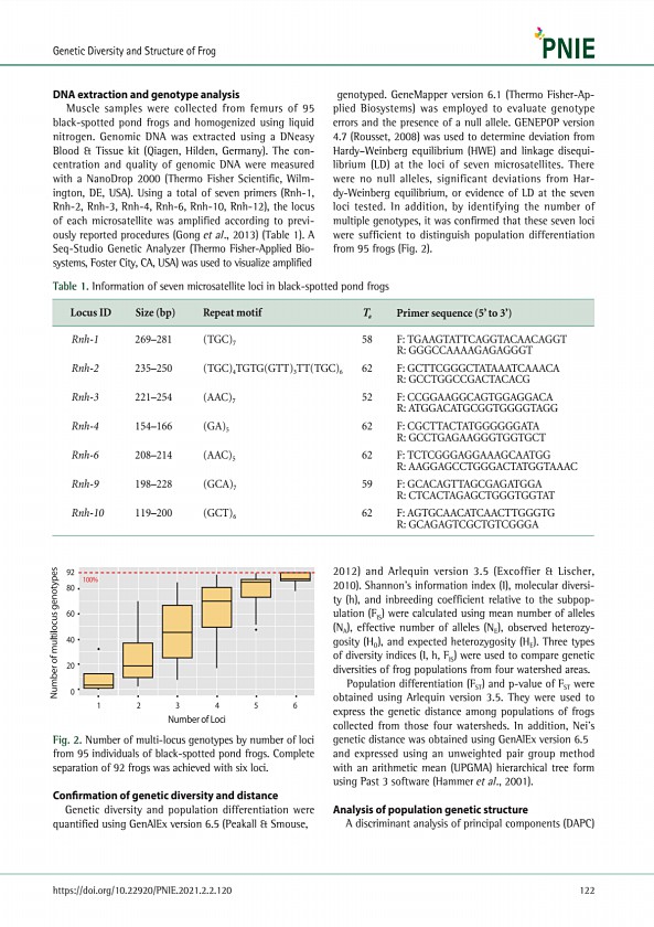 DNA extraction and genotype analysis Muscle samples were collected from femurs of 95 black-spotted pond frogs and homogenized using liquid nitrogen. Genomic DNA was extracted using a DNeasy Blood & Tissue kit Qiagen, Hilden, Germany The concentration and quality of genomic DNA were measured with a NanoDrop 2000 Thermo Fisher Scientific, Wilmington, DE, USA Using a total of seven primers Rnh-1, Rnh...