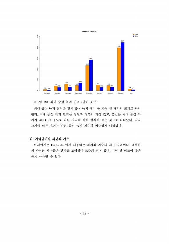 35 그림 18 최대 중심 녹지 면적 단위km2 최대 중심 녹지 면적은 전체 중심 녹지 패치 중 가장 큰 패치의 크기로 정의 된다. 최대 중심 녹지 면적은 강원과 경북이 가장 컸고, 충남은 최대 중심 녹 지가 200 km2 정도로 다른 지역에 비해 현격히 작은 것으로 나타났다. 격자 크기에 따른 효과는 다른 중심 녹지 지수와 비슷하게 나타났다. 다. 지역단위별 파편화 지수 아래에서는 Fragstats 에서 제공하는 파편화 지수의 계산 결과이다. 대부분 의 파편화 지수들은 면적을 고려하여 표준화 되어 있어, 지역 간 비교에 유용 하게 사용될 수있다.